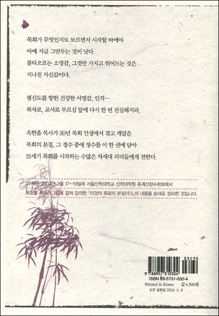 한국교회의 갱신을 부르짖는 옥 목사님의 메시지인지라 귀로 듣기엔 쓴 소리가 많다. 그러나 원래 몸에 좋은 약은 쓴 법이 아닌가. 귀담아 들으면 한국교회가 빠져 있는 영적 침체 요인과 극복방안 등에 대한 진단과 처방이 분명해 진다.