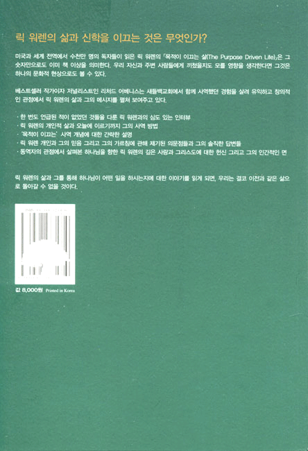 릭 워렌의 삶과 그를 통해 하나님이 어떤 일을 하시는지에 대한 이야기를 읽게 되면, 우리는 결코 이전과 같은 삶으로 돌아갈 수 없을 것이다.